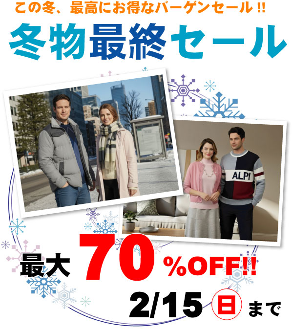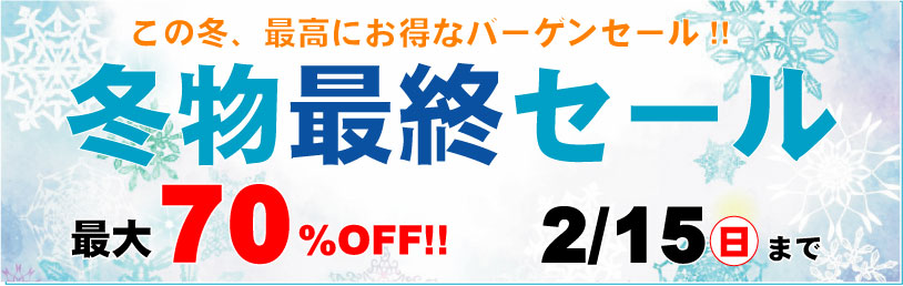 - 冬物最終セール2026いよいよこの冬、最後のバーゲンセールが始まります。 半期に一度の一番お買い得な期間になります。 まだまだお得な… 続きを読む: 冬物最終セール2026